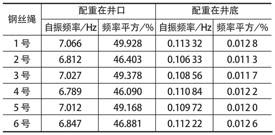 3 故障診斷分析3.1 鋼絲繩張力測試分析 鋼絲繩張力測試在 2 種工況下進行,分別是配重在井口時和配重在井底時。測試時,提升機要保持靜止狀態,用小錘依次敲擊鋼絲繩,并用測振儀器記錄數據。從非驅動側到驅動側的鋼絲繩編號為 1~6,如圖 2 所示。鋼絲繩振動測試結果如表 1 所列。